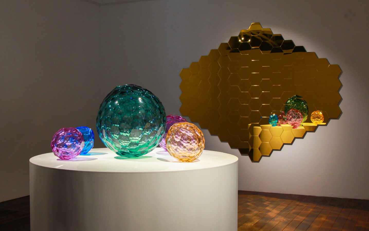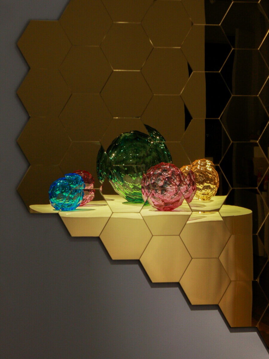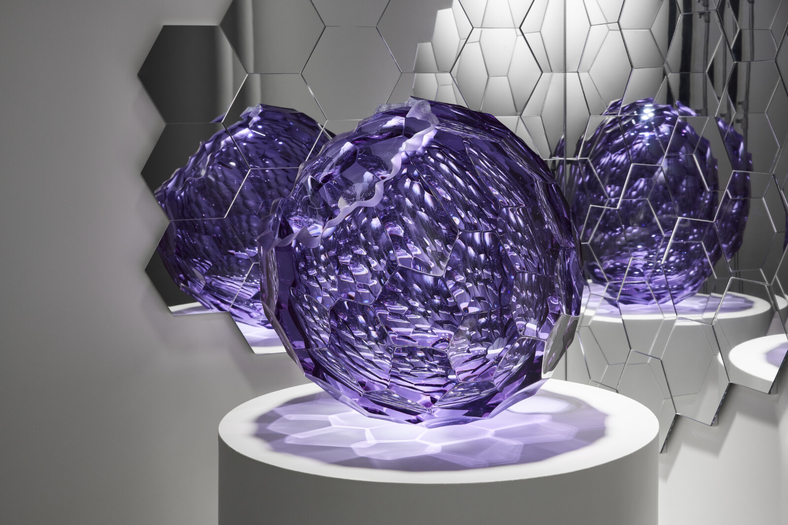 박성훈의 작업 세계는 ‘Void’ 시리즈에서 ‘Breathing Void’에 이르기까지 줄곧 ‘비움’과 ‘확장’을 탐구해 왔습니다. ‘Void’가 호흡을 불어넣은 에너지의 응축을 표현했다면, 이번 ‘Breathing Void’ 신작들은 작가의 DNA와도 같은 ‘육각형’ 구조 위에 구축되어, 퇴적된 시간의 결을 담고 빛의 분절과 재조합을 통해 호흡하는 공간을 드러냅니다. 육각형 패턴은 단순한 장식이 아니라, 마치 우주선 패널이 광대한 빛을 모아 다시 우주로 확산시키듯, 박성훈의 작품 속에서 무한을 실험하는 근본 장치로 작동합니다. 유리 표면을 따라 끊임없이 갈라지고 재편되는 빛은 새로운 색과 공간, 그리고 지각의 층위를 형성하며 관람자를 변주의 경험 속으로 이끕니다.